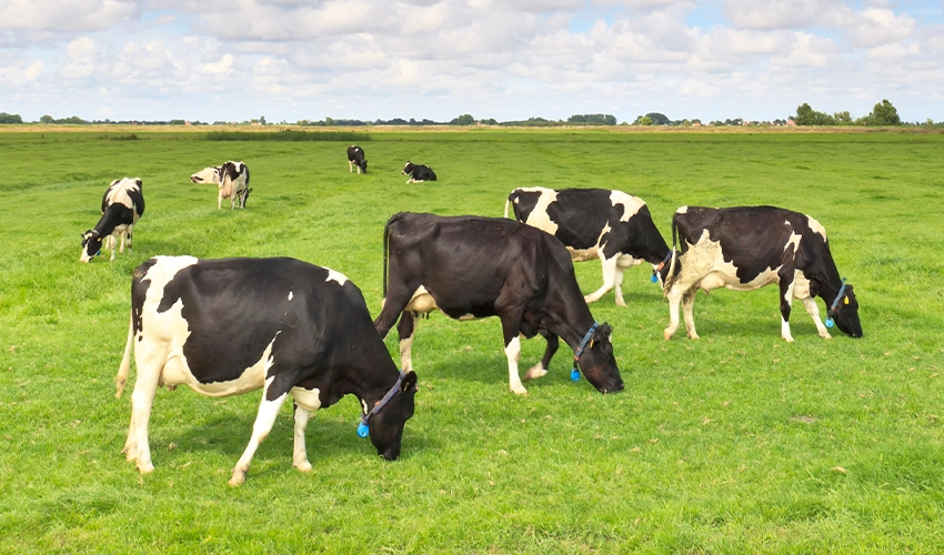 Svartvita kor vid ett foderbord med pelleterad Easy Start ovanpå mixen
