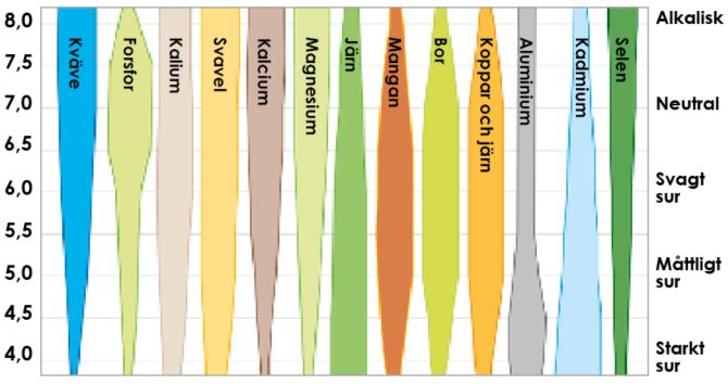 Ph- värdets påverkan på växtnäringsämnen i marken, där bandet är som bredast är tillgängligheten för grödan bäst