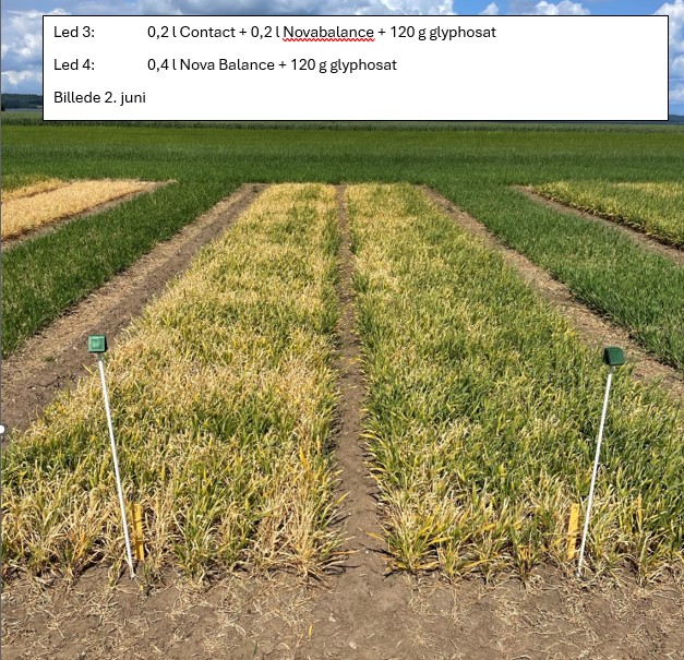 På bilden ses effekten av att tillsätta Herbinass. I rutan till vänster har 0,2 l Novabalance + 0,2 Herbinass använts tillsammans med glyfosat och på bilden till höger har dubbel dos Novabalance använts. Vi ser den bästa effekten där Herbinass har tillsatts.